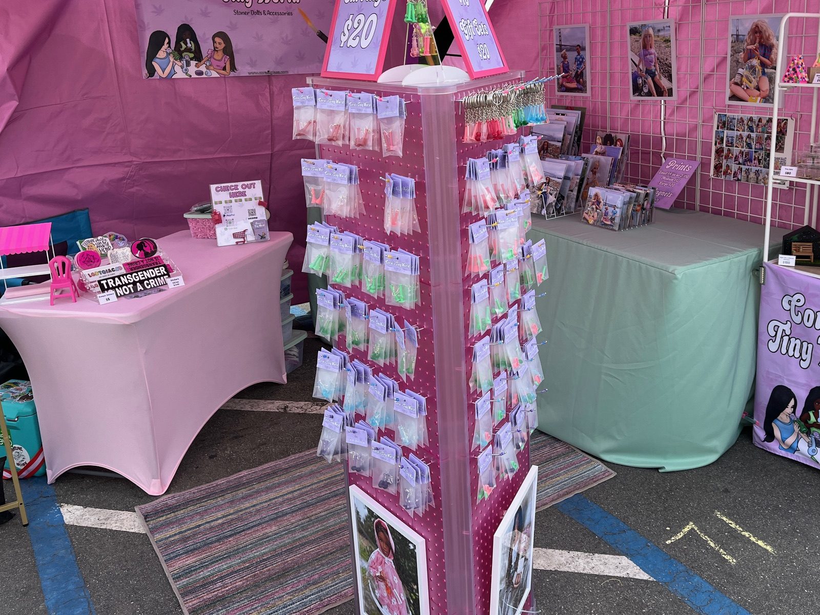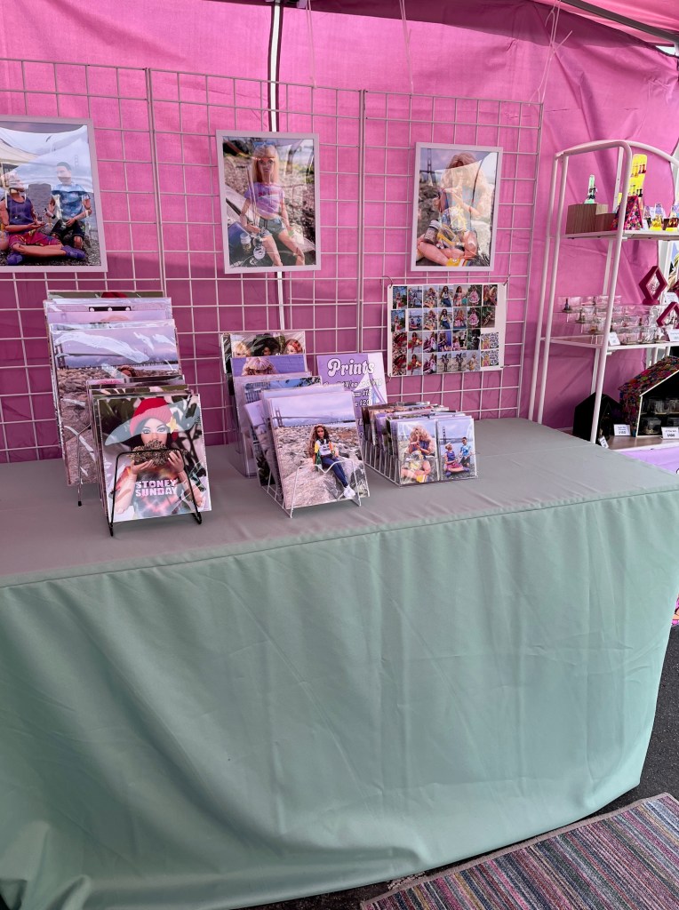 Refillable sandbag tent weights are absolutely a must, and help sturdy up the tent. The light pink elastic footed tablecloths looked absurd with the table risers we use, so I replaced them with long light green ones, and I clip any excess fabric out of the way. I also love how the green compliments the pink but isn’t matching, I was starting to drown in shades of pink and repel some potential customers. Bringing in the greens and lavenders makes my market booth a lot more approachable while still being bright and my own personal style.