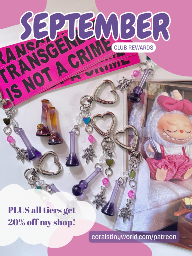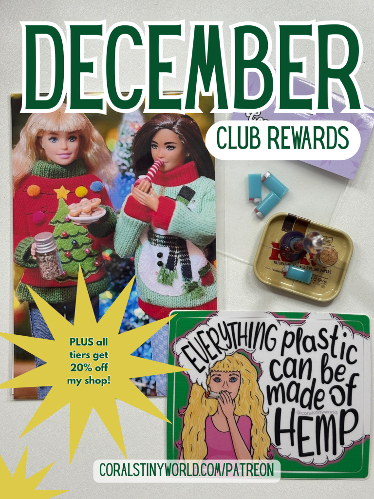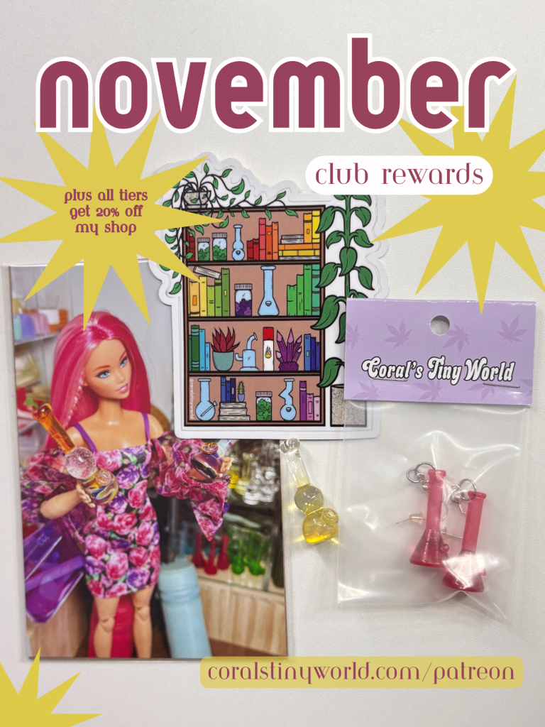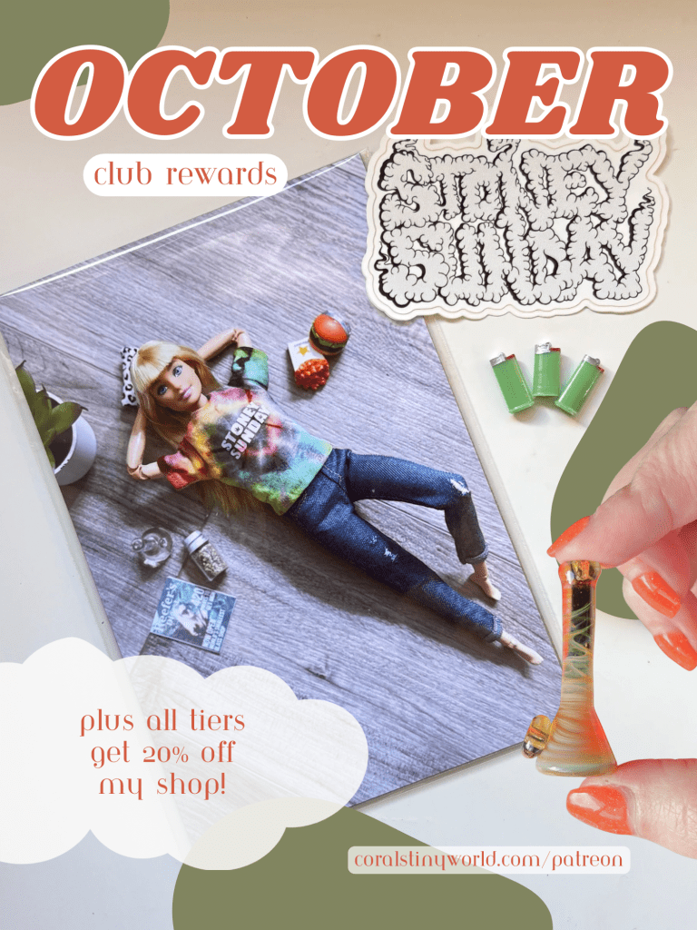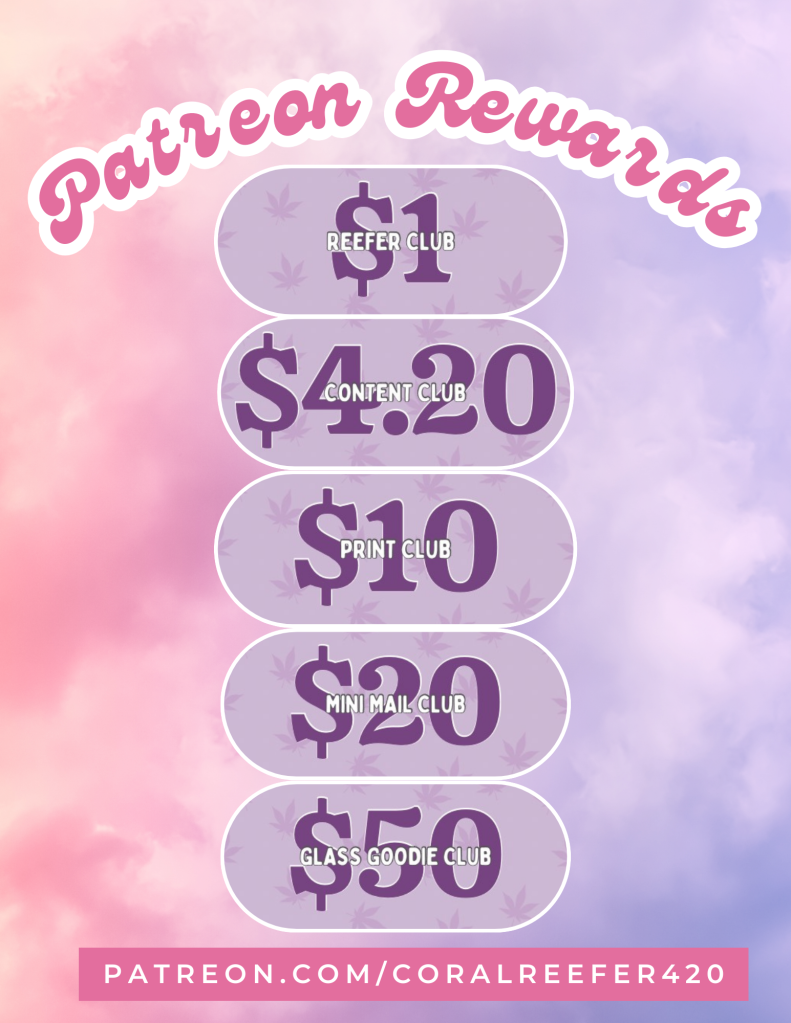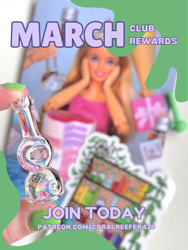 The higher the tier you’ve joined, the more goodies I’m sending your way! From a print and sticker, to miniature stoney essentials, all the way up to a real borosilicate glass surprise each month. Check back here often to see what’s new!